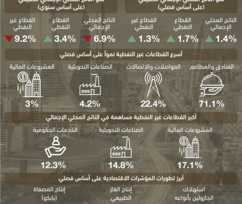 وعكست المؤشرات الاقتصادية التطور في أداء عدد من القطاعات غير النفطية خلال الربع الثالث من عام 2020 مقارنة بالربع الثاني من العام الحالي، حيث سجل قطاع الفنادق والمطاعم أكبر نسبة نمو بلغت 71.1%، تلاه قطاع الاتصالات والمواصلات الذي حقق نمواً بنسبة 22.4%، وقطاع الصناعات التحويلية الذي شهد نمواً بنسبة 4.2%، فيما حقق قطاع المشروعات المالية نمواً بلغ 3.0%.